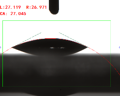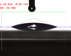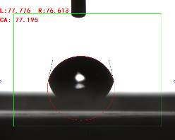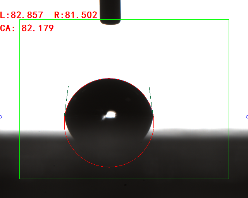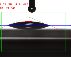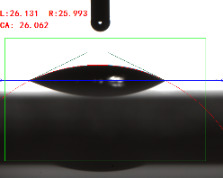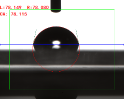 寬高法(量高法或Θ/2法)手動(dòng)畫出液滴的高度和接觸面寬度,通過反三角函數(shù)求出其接觸角(0.3ul或低角度時(shí)可使用)