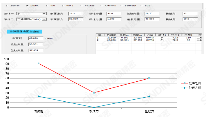 等離子處理完成后,可使用接觸角測(cè)量?jī)x驗(yàn)證其處理后的效果,通過(guò)對(duì)比前后的接觸角數(shù)據(jù)、極性分量、色散分量、表面能等數(shù)值有效分析和判斷等離子處理的有效性。