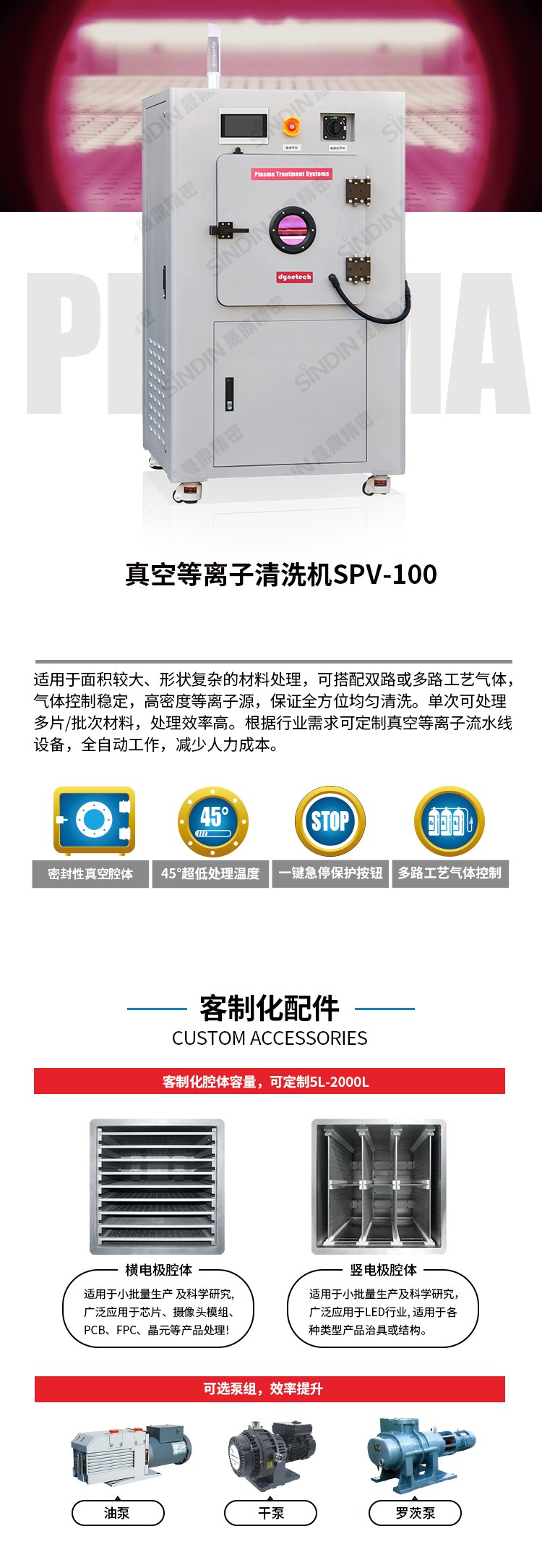 SPV-100 真空等離子清洗機(jī)(Plasma cleaner),氣體通過(guò)激勵(lì)電源離化成等離子態(tài),等離子體作用于產(chǎn)品表面,清洗產(chǎn)品表面污染物,提高表面活性,增強(qiáng)附著性能。等離子清洗是一種新型的、環(huán)保、高效、穩(wěn)定的表面處理方式。